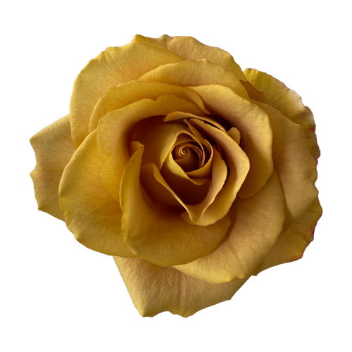 The Heart of Gold Rose is a striking, solid-colored rose known for its intense golden brown antique yellow throughout the entire bloom. Unlike other yellow roses with fading or pale edges, this variety maintains a consistent, saturated color from the center to the outer petals. Its classic, high-centered shape and vibrant tone make it a standout choice for bright and joyful arrangements.