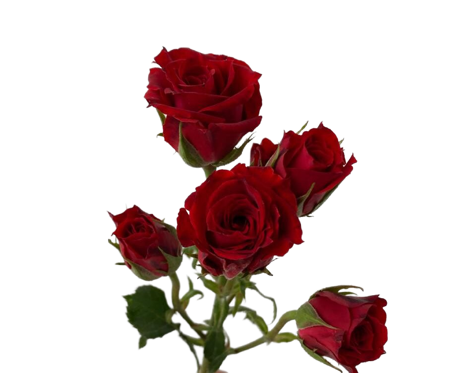 The Red Mikado spray rose is a striking variety known for its vibrant red hue and classic elegance. It features clusters of small to medium-sized blooms on each stem, with each flower showcasing velvety petals and a beautifully rounded shape. The petals are a rich, true red with a slight sheen, making it a favorite for adding depth and drama to arrangements.