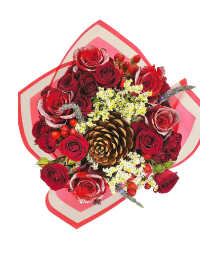 Recipe: Tinted Glitter Rose, Spray Rose Red, Hyperycum Red, Limonium Piña Colada, Lavender Fresh, Pine Cones.