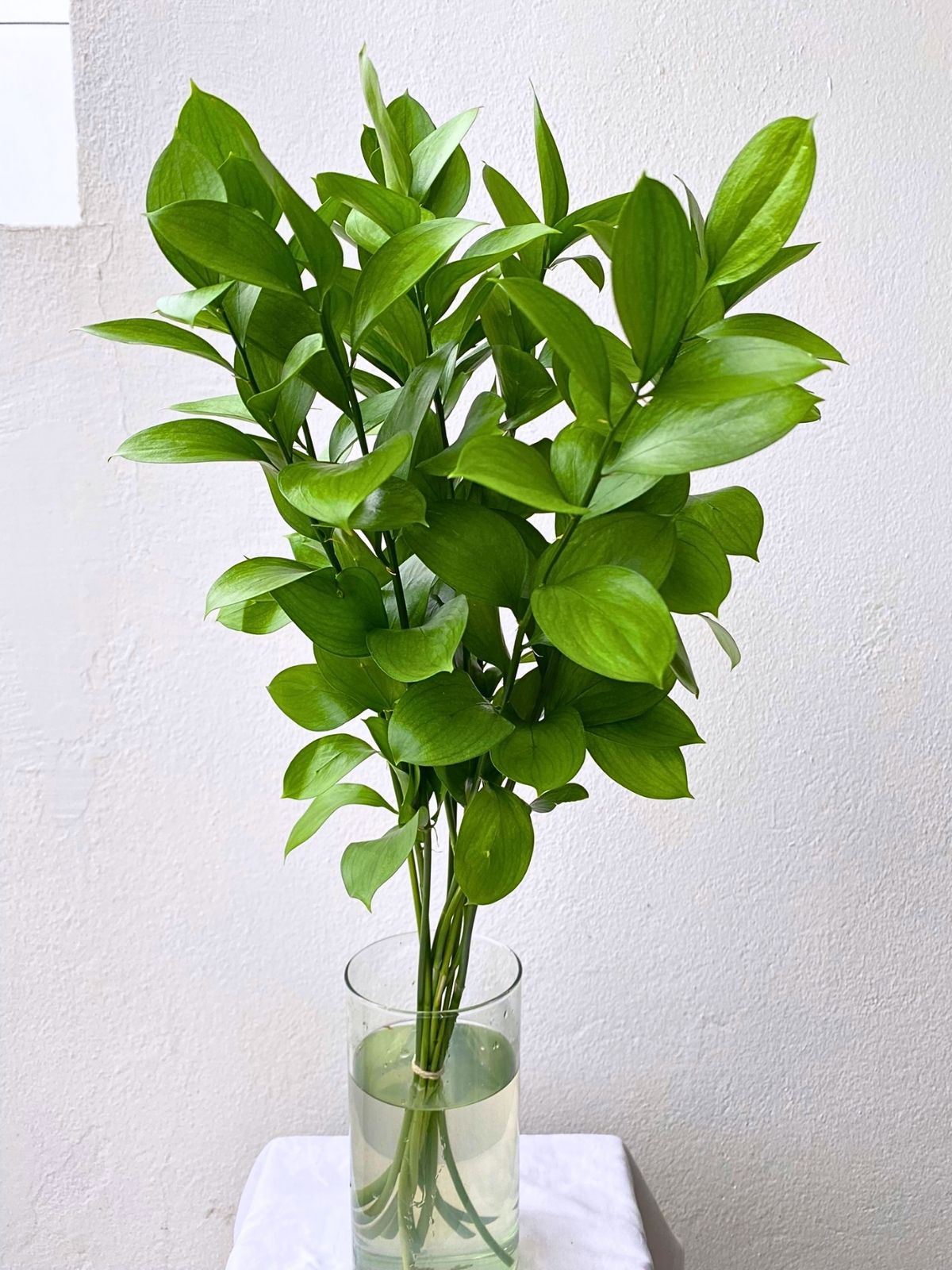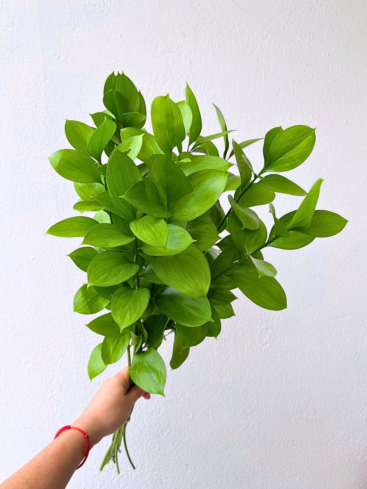 Ruscus has dark green, glossy foliage with a unique, lance-shaped appearance. It’s commonly used as a filler or greenery in arrangements, adding a lush, classic touch.